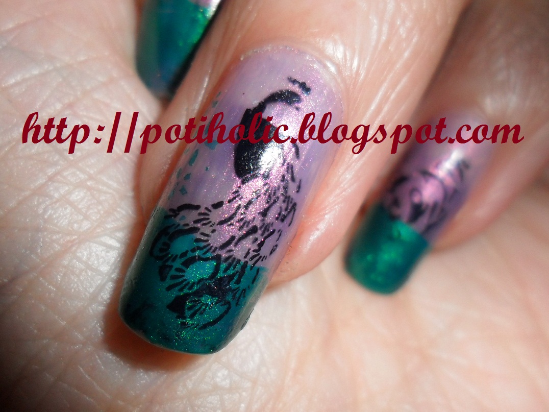 Y para finalizar, probé a estampar dibujos gruesos con esmaltes YesLove, de venta en bazares chinos. El resultado es bueno, aunque se rebaje la intensidad de color. Os muestro un trébol hecho con un tono verde manzana. Lo ideal sería emplear tonos sangre, chocolate, azul muy intenso, o el mismo verde del prado de este paisaje de manicura. No intentéis estampar dibujos de trazo fino con YesLove porque se secan con rapidez y no da tiempo a sacar el trazado perfecto. Para muestra, las estrellas que acompañan al mapachito, la gruesa salió, pero la fina se quedó “partida”.