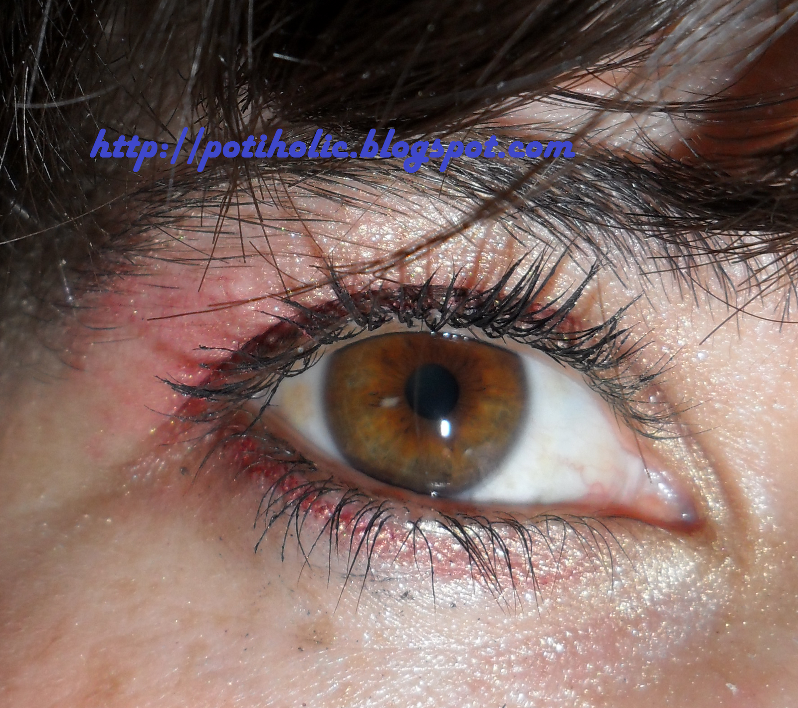 Las sombras empleadas fueron un tono dorado suave de una paleta Kate de Kanebo y el rojo de los Paint de MAC (creo que ya no hacen ese tono ).
