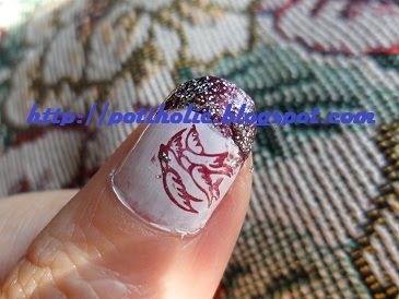 Las placas de Dashica son las mejores que yo haya probrado, pues permiten hacer diseños complicados con esmaltes no específicos para estampar y de una manera sencillísima. En el look que os muestro, he empleado para estampar un rojo de China Glazé, edición limitada. Veréis que el resultado en el pulgar no es del todo bueno porque la manicura la hice de noche y las fotos las saqué al día siguiente. Pero tuve la mala suerte de ir a guardar los esmaltes cuando aún no estaba todo bien seco, con lo que tuve un percance y debí repararlo a modo de parche.