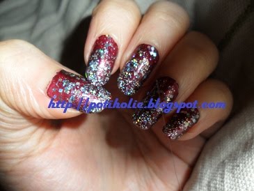 Para el glorioso, que no discreto, estreno intenté crear un efecto degradado donde la concentración de partículas pequeñas y multicolores del Hello Holo fuera decreciendo para dar paso a un incremento en la concentración de pailletes tipo bola de discoteca años 70 de Julia. No lo conseguí del todo, pero aún así me gustó el resultado. Aunque me gustaría que alguien me explicara por qué las manicuras con putiuñas me duran tan poco tiempo en buen estado.